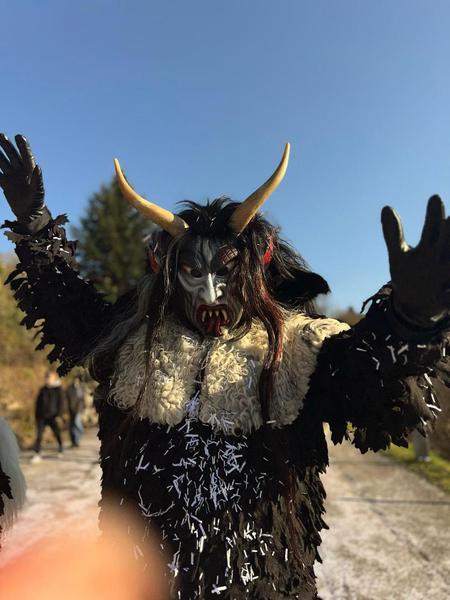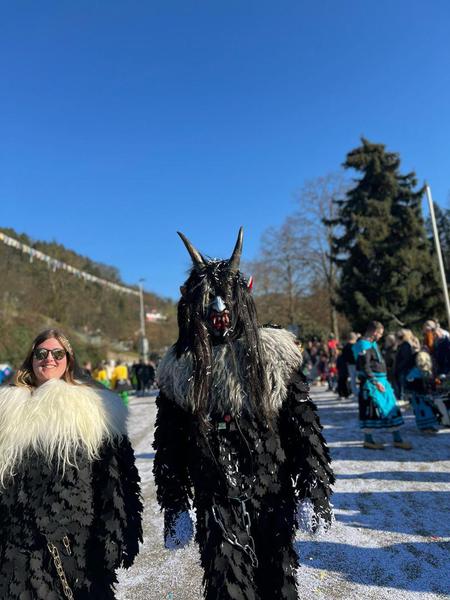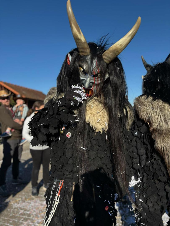 ...einer Zimmermannshose mit Schlag auf der unsere einzigartigen "Spättle" aufgenäht sind. Einzigartig deshalb, da wir die Form selbst entworfen haben und in einem aufwendigen Arbeitsvorgang fertigen ließen. Der Hosenschlag wird von echtem Schaffell ummantelt und lässt die Füße somit schwerfälliger aussehen.