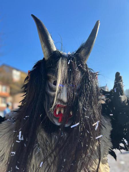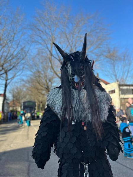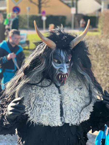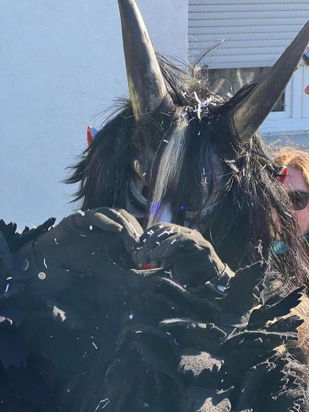 Das Kopffell besteht aus Ziegenfell und einzelnen Strähnen von verschiedenen Pferdeschweifen - überwiegend in schwarz.